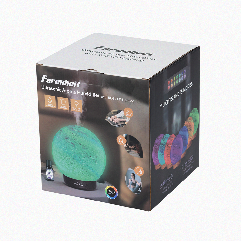 Our Farenheit 24V Ultrasonic Glass Essential Oil Diffuser adds a soothing touch to your room with a pleasant fragrance, creating the perfect aromatherapy environment for a good night's rest. This essential oil diffuser with ultrasonic technology disperses fragrance without heat or a fan, preserving the pure therapeutic benefits of your oils. The energy-efficient design ensures continuous operation without the need for filters or wicks. At the same time, the glass diffuser with 7-color LED lighting emits a warm and cozy glow, complementing any home or office décor. Refresh your air with a cool mist aromatherapy humidifier that enhances relaxation and well-being in any space.